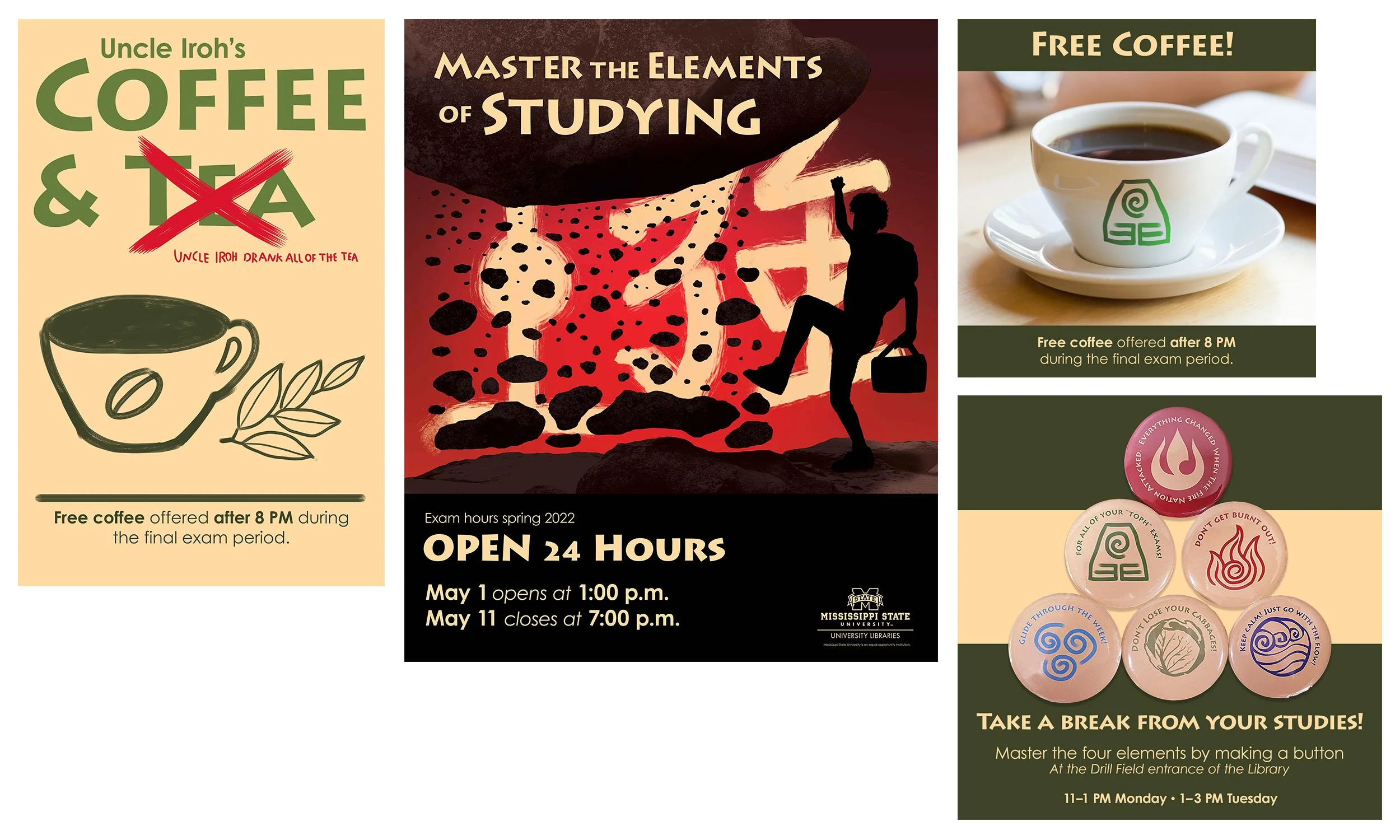 These graphic elements were created to promote an event for university students so that they can relax from studying. Each event takes inspiration from a piece of popular media. The 2022 event in which I worked on took inspiration from the animated tv series Avatar: The Last Airbender.